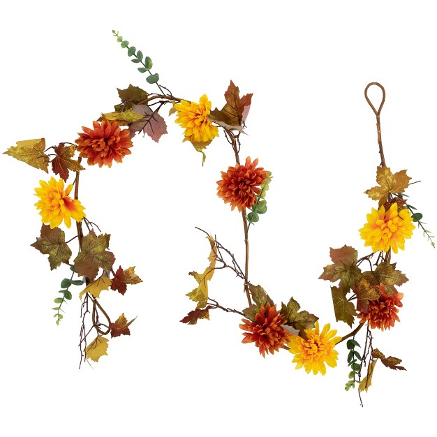 Everyone should take the time to watch the leaves change. Capture the feeling of a crisp fall day with this lovely autumn garland. Display alone or pair with other decorative items to create a unique decoration.Product Features:UnlitCovered with beautiful red and orange fall colored leaves and mum flowersRecommended for indoor use onlyBendable wire center allows for you to shape the garland any way you desireBrown metal hooks on each end for easy hanging Dimensions: 5.5 long x 6 wideMaterial(s): PVC/plastic/wire